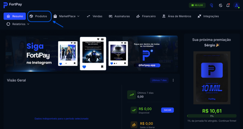 Passo 01: Dentro da sua dashboard Clique na área de Produtos