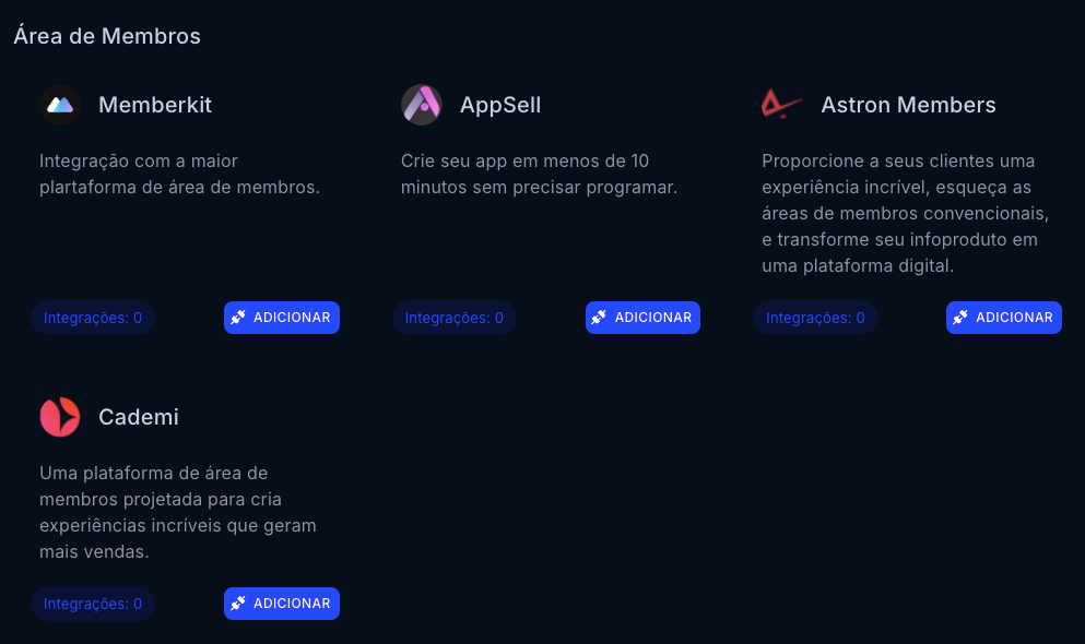 – Área de Membros Externa: Basta realizar as integrações com as seguintes plataformas disponíveis.