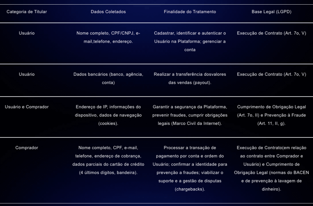 • Entre Usuário e Comprador: Os dados de contato do Usuário (e-mail de suporte) são disponibilizados ao Comprador no comprovante da transação para que ele possa solicitar suporte. Da mesma forma, dados da transação do Comprador são compartilhados com o Usuário para que ele possa realizar a entrega do produto/serviço e a gestão de sua venda.
